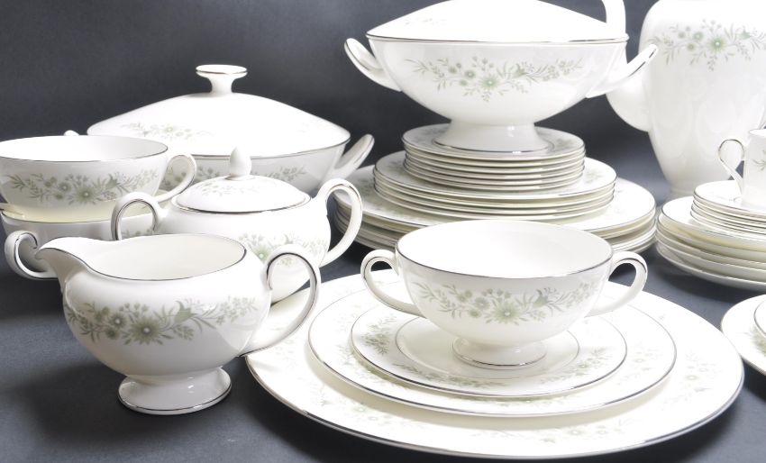 A vintage 20th century porcelain Wedgwood dinner service in the Westbury pattern having green foliate decoration. The service comprises of cups, saucers, gravy boat, tureens and more. Makers mark to the underside.