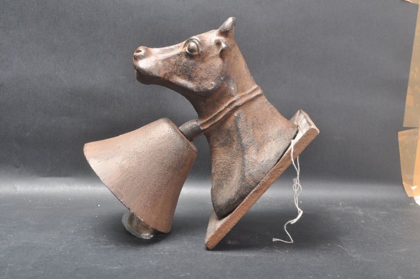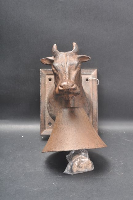 A vintage style cast iron cows head rustic bell / door bell having a rectangular wall mounted plaque, cow head cast to the front with oversized bell. Measures 19cm long.