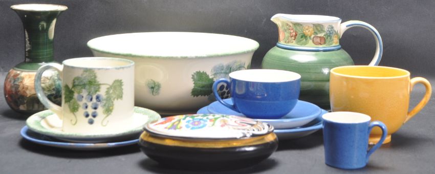 A collection of 1980’s ceramic porcelain ware to include a jug and a vase by Jersey Pottery, Poole Pottery cup, saucer and large bowl, Moorcroft cups and saucers along with a Hollohaza Hungary lidded pot.