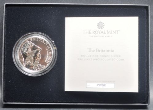 The Royal Mint - 2021 Britannia ' UK One Ounce Silver Brilliant Uncirculated Coin '. Mint, as new, housed in its original presentation box with certificate and sleeve. As new.
