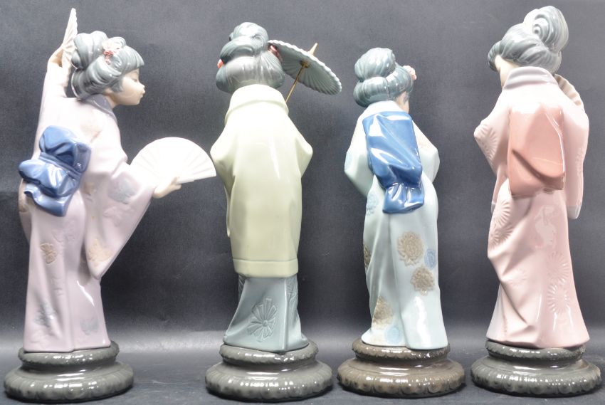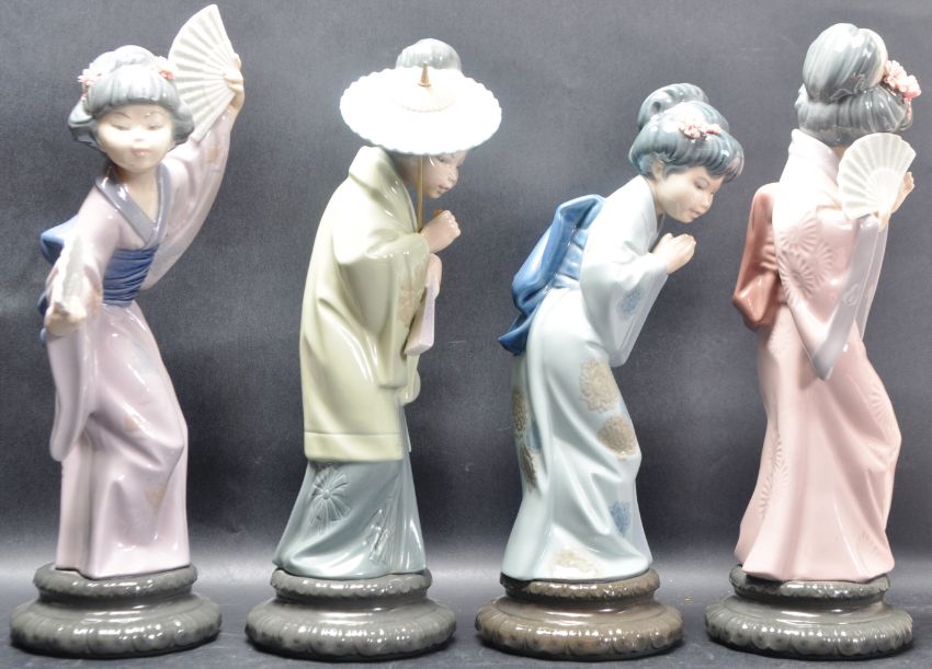 Set of four Spanish ceramic porcelain Geisha girl figurines by Lladro. The collection comprising of Japanese White Fan - 4991 designed by Salvador Debon, Timid Japanese Geisha Girl - 4990 designed by Salvador Debon, Oriental Spring - 4988 designed by Salvador Debon, Sayonara Japanese Geisha Girl - 4989 designed by Salvador Debon. All with makers marks to the underside. Condition: Oriental Spring - 4988 - umbrella handle broken but easy to repair. Measures 30cm tall.