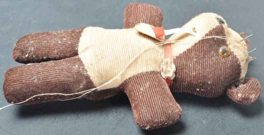 A vintage retro mid 20th century circa 1960’s Pull My Tongue teddy bear pincushion. The two tone teddy bear having dark brown head, arms and legs, with light cream belly and a red tongue tape measures. No makers marks.
