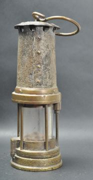 An early 20th century Thomas A Williams Aberdare Welsh miners mining lamp having a hook to the top over a cylindrical glass shade with makers badge to the front. Measures 25cm high.