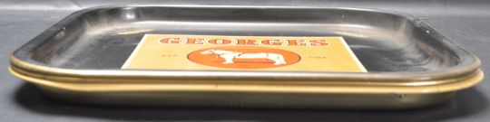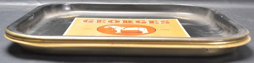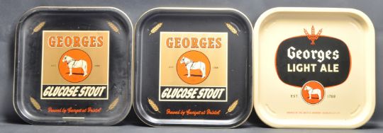 A set of three vintage retro mid 20th century circa 1970’s Bristol interest pub advertising metal serving trays for Georges brewery. The metal trays of a square form with raised margins and company logo painted to the centre.