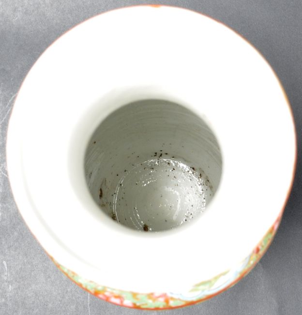 A 19th century Chinese Cantonese Famille Verte vase having a waisted neck with polychrome floral decoration and panels of figures and insects. Measures 25cm. Good condition, Measures 23cm tall.