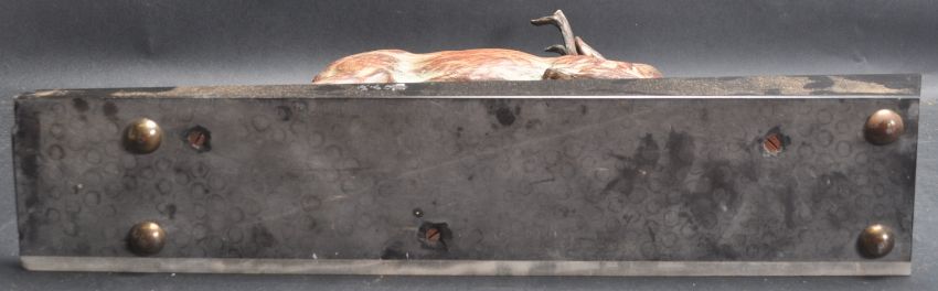 An early 20th century Art Deco cold painted cast metal deer on a marble base. The deer raised on three legs facing left on black marble and white marble base. no makers marks. A/ F. 37cm Tall.