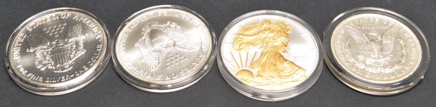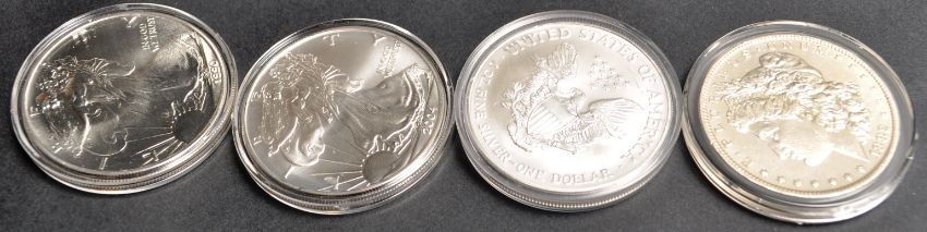 A collection of four US Silver coins comprising of a 2004  Brilliant Uncirculated .999 Silver Eagle 1 Troy ounce coin, Morgan Dollar coin 900/1000 26g, 1990 Silver Eagle .999 Brilliant Uncirculated 1 troy Ounce coin, 2005 gold plated .999 silver coin with 24ct gold plating, 1 Troy ounce. Comes with certificates.