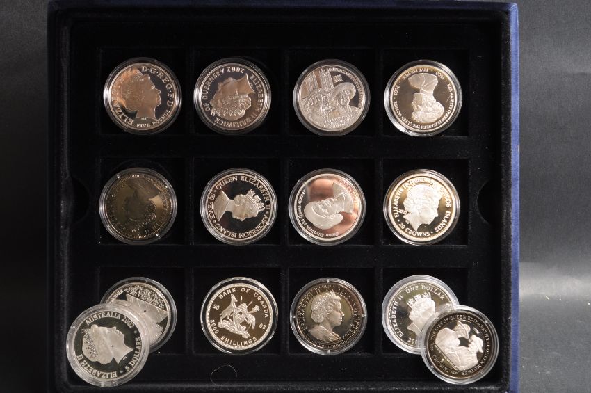 A collection of fourteen Silver proof Queen Elizabeth  The Queen Mother 1900 - 2002 coins comprising of a .925 silver £5, .925 Guernsey Silver £5, .925 silver Jersey £5, .925 silver 50p, Turks & Caicos .999 20 crowns, Uganda 2000 999 silver shillings, 1 Crown .925 silver Isle of Man, 50p Tristan da Cunha, 50p 999 silver 1 troy Ounce, .925 silver Gibraltar one crown, Australia $5 dollar coin, Gibraltar 1 Crown. Comes with a HM Queen Elizabeth presentation cards.