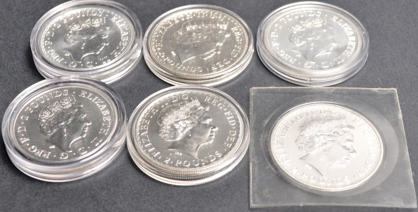 Coins - a collection of x6 assorted 1oz / one ounce £2 silver proof / uncirculated coins - all encapsulated - to include; Britannia 2005, Year Of The Dog 2018, 2020 Crest, Britannia 2003, Britannia 2017, and Britannia 2012.