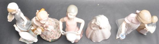 A collection of six Spanish ceramic porcelain figurines. The collection comprising of Girl With Duck 1052 by Lladro, Dreamer Girl with Straw Hat 5008 by Lladro, Girl with Pig 1001 by Lladro, To Light The Way by Nao, Bride Praying by Nao and a ceramic porcelain figurine by Ramon Ingles. All with makers mark to the underside. Tallest measures 28cm.
