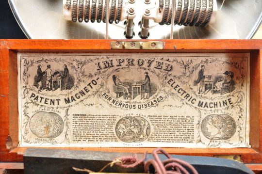 A 19th century Victorian circa 1880’s medical electromagnetic disease machine by Improved. The patent magneto - electric machine for nervous diseases well presented in a mahogany case with original makers label / instructions to the inside. Together with a vintage twin arc Sunday lamp.