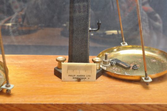A vintage 20th century glass and oak cased balance scale retailed by Philip Harris of Birmingham. Scales comes with a set of weights from 2g to 100g. Measures 44cm x 46cm x 26cm.