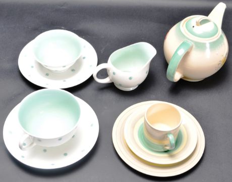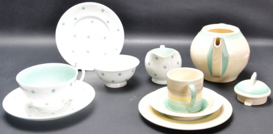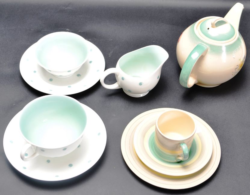 A group of vintage 1930's 20th century Susie Cooper ceramic ware to include a blue and cream teapot decorated with floral sprays, green yellow and gray coffee cup, saucer and side plate, green and white tea cup, saucer, side plate, creamer jug and sugar bowl. All with makers mark to the underside.