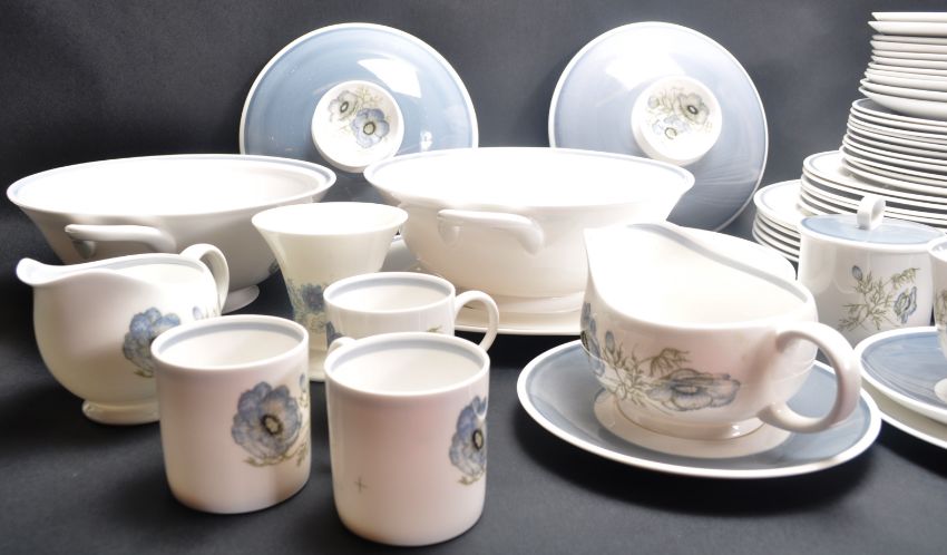 A large vintage 20th century Susie Cooper dinner service in the Glen Mist pattern. Service comprises of cups, saucers, plates, tea pot and more. Good condition. Largest measures 22cm