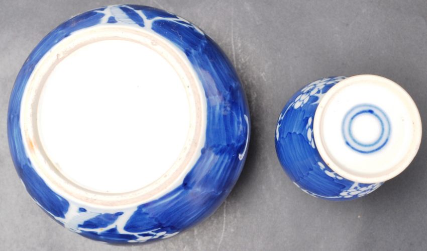 Two 19th century Chinese Ceramic blue and white vases comprising of a ginger jar with prunus decoration together with a vase having a waisted neck with a tapering body and prunus decoration. Both having double concentric circles to the base. Measures 14cm.