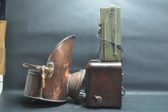 An early 20th century copper coal scuttle with swing handle atop along with a Bakelite Bush radio.