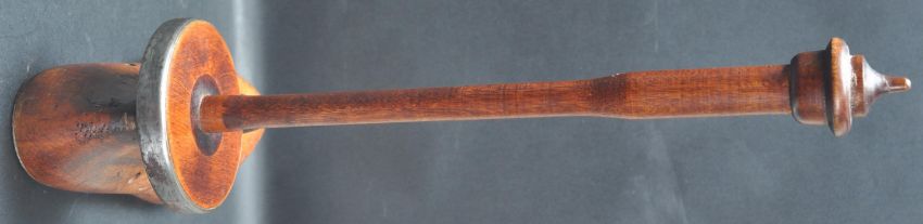 An early 20th Century wooden shoe stretcher having a turned wooden handle with carved wooden foot with makers stamps.