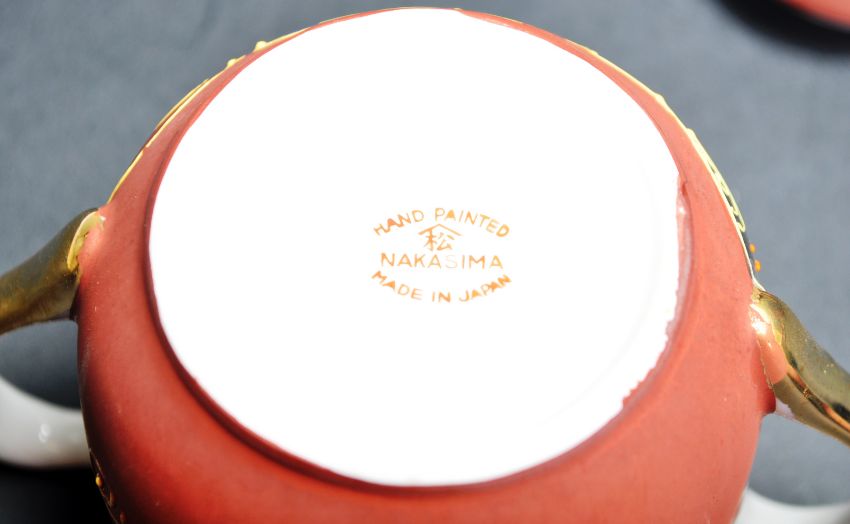 A vintage 20th century Japanese hand painted tea service by Nakashima. The ceramic porcelain tea set comprising of cups, saucers, teapot, creamer jug, sugar bowl. All the pieces being decorated with traditional Japanese people scenes on a matt brown background with makers stamps to the underside.