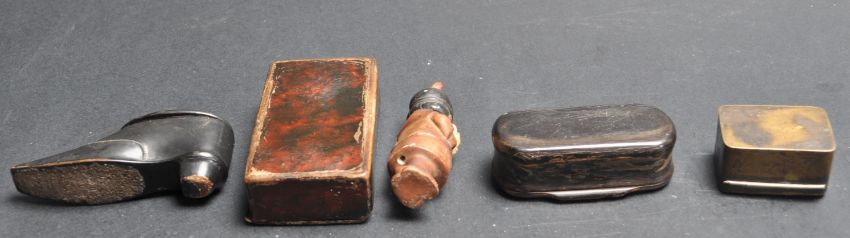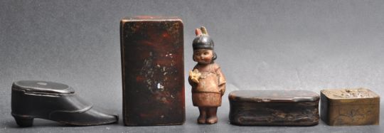 A collection of 19th century Victorian circa 1880’s snuff boxes. The collection comprising of papier mache snuff box in a form of shoe with hinged lid, papier mache snuff box of a rectangular form with hinged lid, turtle shell snuff box of a rectangular form and a Chinese oriental brass snuff box with raised people scenes decoration.  Measures 8cm tall.