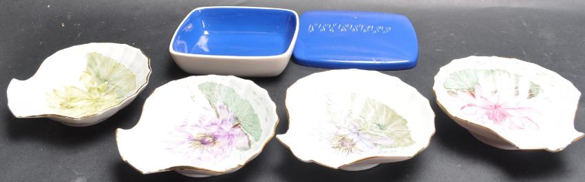 A collection of four 20th Century hand painted ceramic porcelain ashtrays / pin trays by Kaiser. The ashtray / pin trays in the form of scallop shells being hand painted with water Lilies to the centre raised on a circular foot with makers mark to the underside. Along with a 1960’s lidded box signed by Willi Luntz.