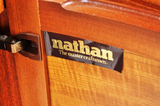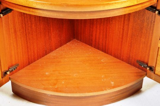 Nathan - Squares - A set of three retro vintage 1960's teak wood corner units comprising of a tall upright examples and a pair of lower corner units raised on plinth bases. Measures 194 x 63 x 45 cm.
