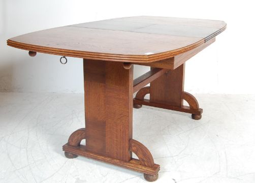 An early 20th century circa 1930’s Art Deco oak veneer extending dining table. The table having a two piece top with metal extending mechanism, two piece fold in leas, shaped edges raised on unusual base decorated with square oak vintage panels and Art Deco arches / motifs with bun feet. No makers marks. 76cm h x 166cm w x 90cm d