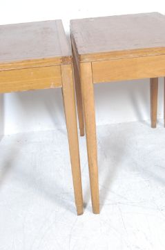 A group of four vintage retro mid century air ministry type oak writing table desks, each having a rectangular top with brown leather panels raised on tapering square legs. 77cm h x 84cm w x 53cm d