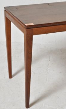 A mid 20th century circa 1960s Danish teak wood long john coffee / occasional table. Raised on square tapering legs rising through the fitted frieze to a rectangular table top being chamfered into the frieze with reeded detailing. Measures, 45 cm H x 84 cm W x 38 cm D.