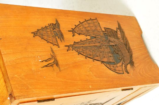 A mid 20th century Chinese hardwood cabinet having double doors with impressed decoration of Chinese junks to the front and side. The cabinet opens to reveal a shelved interior. Measures, 75cm x 92cm x 33cm.