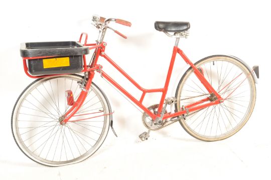A vintage retro circa 1970 Post Office bicycle, finished in red enamel paint with rod brakes and parcel rack. Measures 55cm.