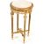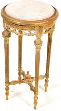 A late 20th century Louis XVI revival side table / occasional table having a circular white marble top over a carved frieze raised on reeded taper supports united by an x stretcher. Measures, 74cm x 39cm.