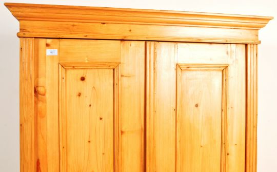 A large mid 20th century country style pine school cupboard / kitchen cupboard larder. The cupboard having two large full length doors opening to reveal a fitted interior with shelves and drawers to the bottom, raised on a plinth base. Measures, 185cm x 103cm x 48cm.