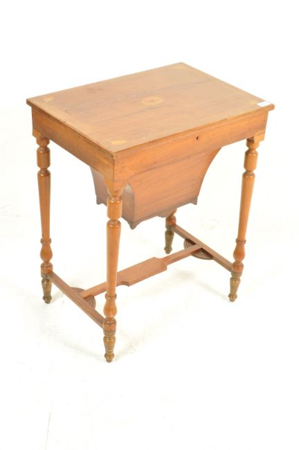 An early 20th century Edwardian mahogany inlaid sewing box. The box of a tall rectangular form having inlaid hinged lid opening to reveal a fully appointed interior with compartments raised on shaped legs united by H-stretchers. Measures 69cm x 56cm x 39cm,