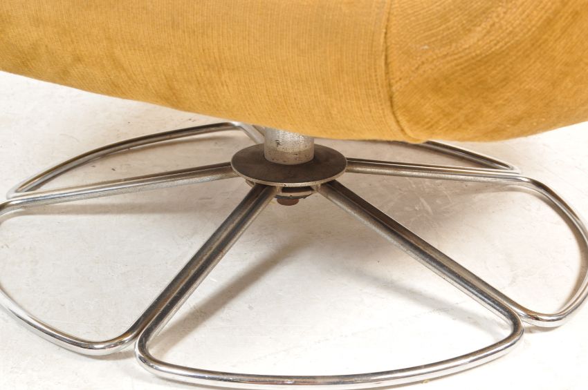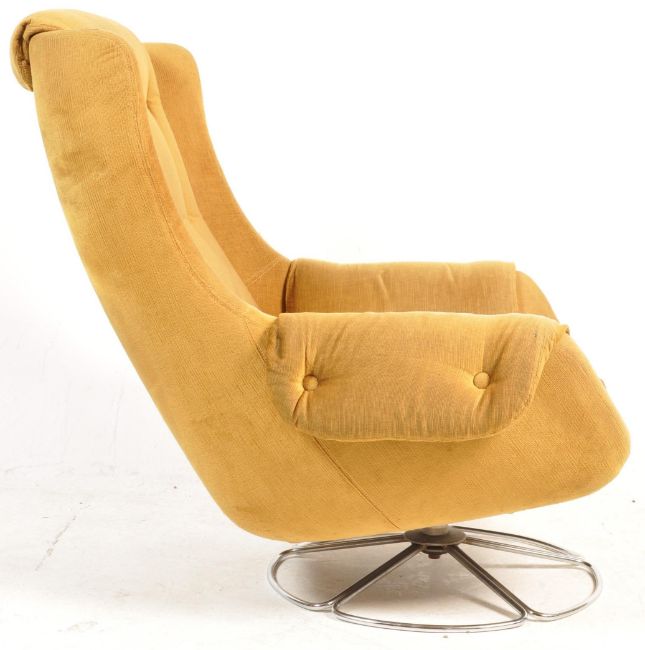 A vintage retro mid 20th century circa 1970’s Danish inspired yellow velvet swivel chair / egg chair / armchair. The chair having a high back with button back and cushion, barrel armrests raised on chrome metal swivel base. Measures, 93cm x 83cm x 96cm.