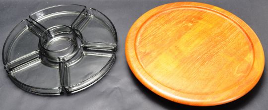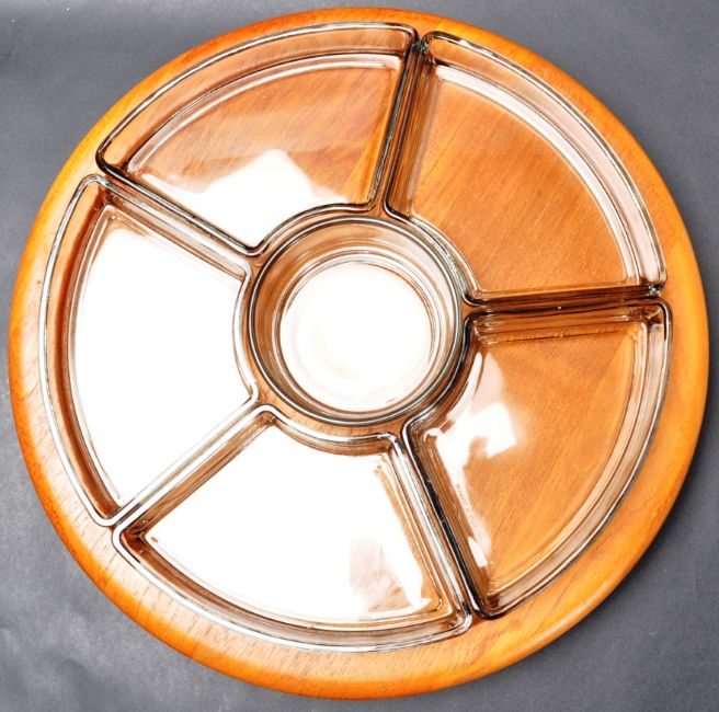 A retro vintage 1970s Danish Lazy Susan by Digsmed having a teak revolving platform with five glass dishes. Measures 32cm wide. Stamped made in Denmark to the glass.