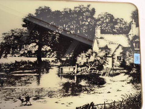 A retro vintage circa 1970s coffee table having a monochrome print of a rural setting with brass edging raised on a black ebonised legs. Measures, 46cm x 92cm x 44cm.