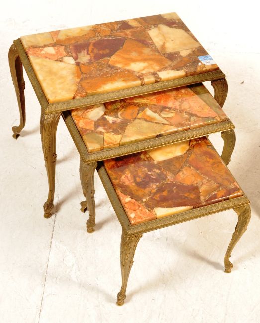A retro vintage circa 1980s onyx nest of graduating tables having brass supports and a vintage 20th century bamboo side table painted in a brown colourway. Measures 70 x 48 cm.