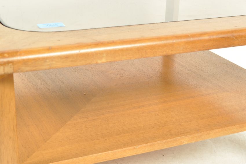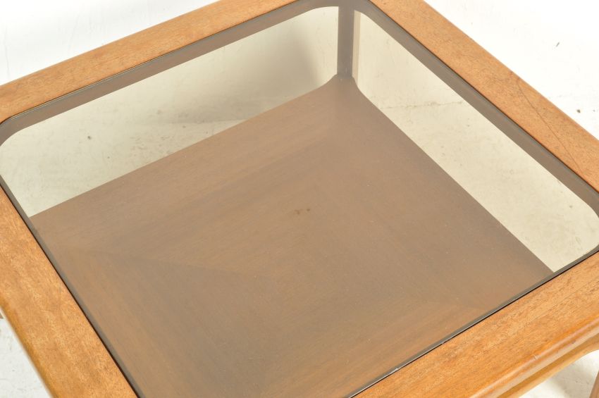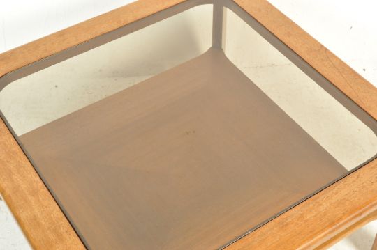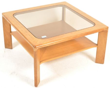 Nathan Furniture - A mid 20th Century retro two tier coffee occasional table of square form by Nathan. The table having a drop in smoky glass panel centre with teak tier below raised on angular supports. Measures 41cm x 76cm x 76cm.