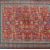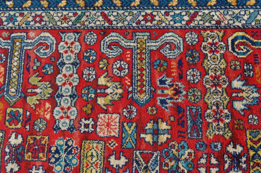A large mid 20th century circa 1960s Persian Islamic carpet rug having a red field decorated with multiple geometrical motifs. Surrounded by a blue border decorated with flower head shape motifs. Measures 350cm x 275cm.