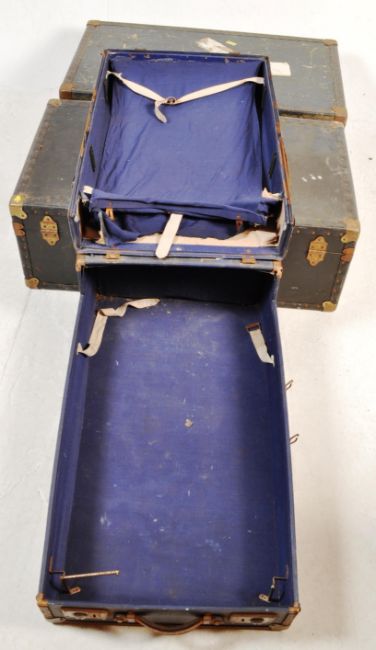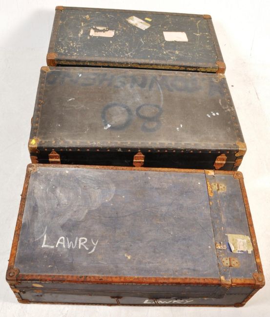 A collection of three early 20th century circa 1930’s shipping trunks / travel trunks. The trunks of a rectangular form with hinged lids and metal bands to the corner finished in dark blue.