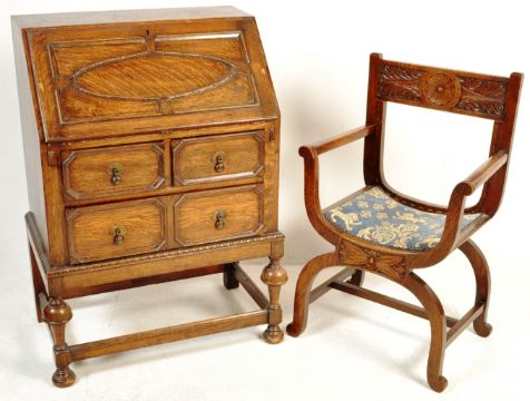 An early 20th century circa 1920s Jacobean revival oak bureau having a fall front writing area opening to reveal a fully appointed interior over a bank of three drawers raised on cup and cover supports united by stretchers with a reproduction Glastonbury chair having a carved crest rail with cushioned seat in medieval style fabric raised on curved legs united by an H stretcher. Measures 104 x 70 x 47 cm.