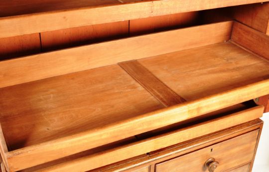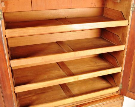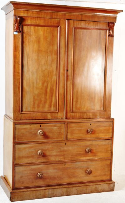 A 19th century Victorian mahogany linen press having a flared pediment cornice, scrolled corbels atop a double door cupboard opening to reveal a shelved interior. The base has a bank of two over two drawers with circular handles raised on a pediment base. Measures, 206cm x 120cm x 50cm.