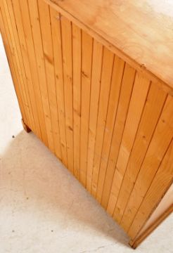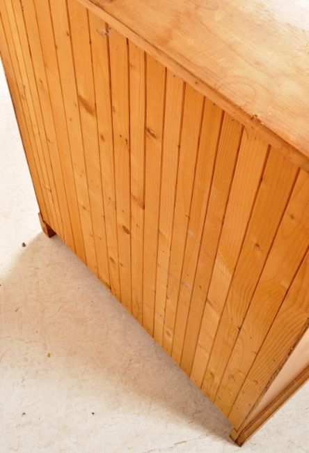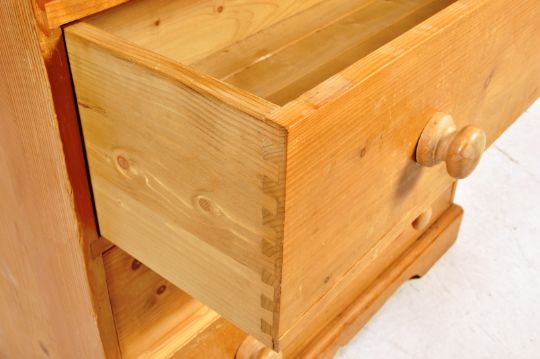 A 20th century pine Victorian revival chest of drawers. The pedestal chest of drawers having a two over three drawers configuration with turned pull handles raised on a plinth base. Measures, 99cm x 86cm x 43cm.