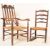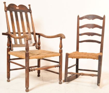 An 18th Century George II reclining elm North Country reclining chair having a shaped double arch top with turned finials, slat back with woven seagrass seat. Along with a smaller similar period chair.