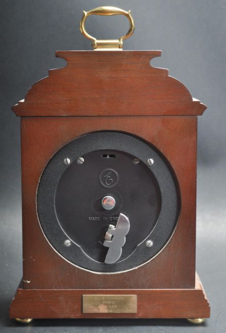 A late 20th century circa 1980s mahogany cased Garrard & Co mantel clock having a brass carry handle to the top, a brass and silvered clock face with Roman numerals to the chapter ring and spandrels to the corner. Measures 24cm.