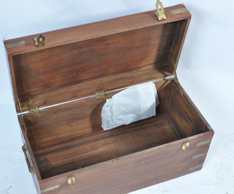A 19th century Victorian mahogany and brass banded tea caddy having a hinged lid opening to reveal a spacious interior. 30cm x 61cm x 30cm.