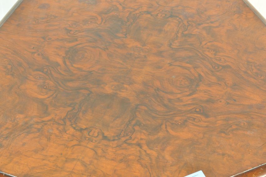 A 19th Century Victorian Aesthetic Movement walnut side occasional wine table in the manner of Gillows of Lancaster having an octagonal table top with burr walnut veneer and chamfered edge raised on turned quad baluster column over shaped 'X' base and legs with white ceramic castors. Measures, 65cm x 56cm x 56cm.