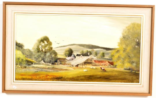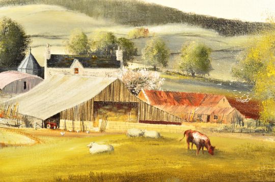 A 20th century oil on canvas painting of Upper Shockerwick Farm near Bath. Signed Haddacks to the verso. Framed and Glazed. Measures 55cm x 92cm.