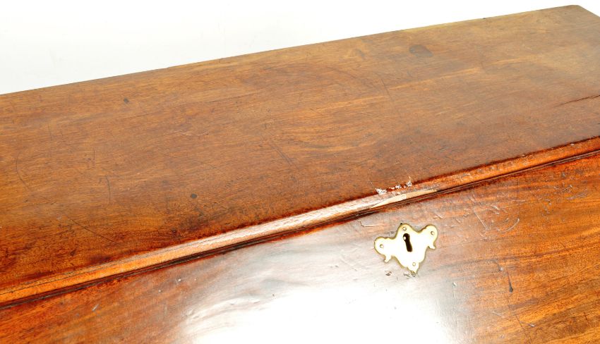 A large  late 18th century  George III mahogany bureau desk of typical form having a fall front bureau section which opens to reveal a fitted full appointed interior. The interior with pigeon holes and central door section flanked by small drawers to each side. Below the top section two over three drawer configuration with all having brass swan neck swing handles and decorative backplates. All raised upon bracket feet supports. Measures 111cm x 107cm x 62cm.