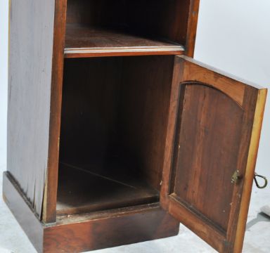 An Edwardian early 20th century mahogany bedside / pot cupboard having a carved pediment top over a pigeon hole recess with carved spandrels atop a single door cupboard opening to reveal a spacious interior raised on a plinth base. Measures, 85cm x 38cm x 36cm.